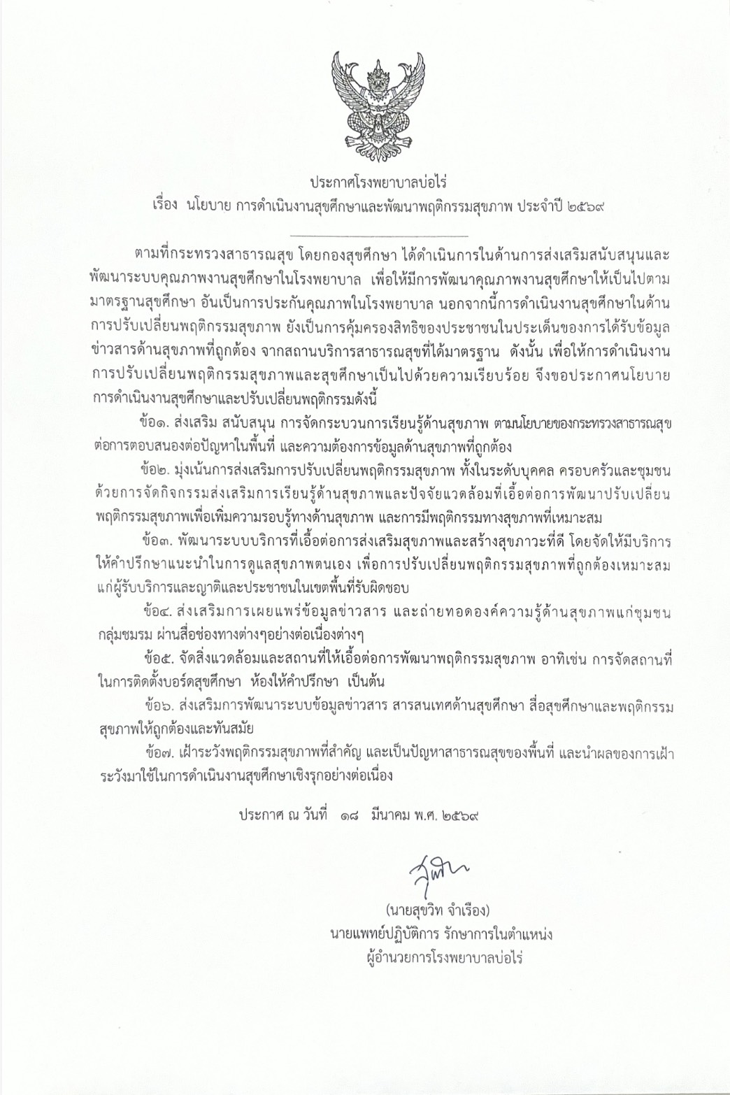 ประกาศโรงพยาบาลบ่อไร่ เรื่อง นโยบายการดำเนินงานสุขศึกษาและพัฒนาพฤติกรรมสุขภาพ ปี2569